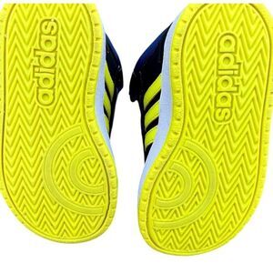 Keywords: adidas sneakers, kids athletic shoes, basketball shoes, casual sneakers, black sneakers, mid top sneakers, padded collar, durable outsole, hook & loop closure, unisex kids shoes, Adidas Hoops, synthetic upper, rubber outsole, activewear shoes, pre-owned sneakers.