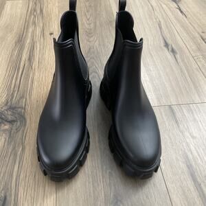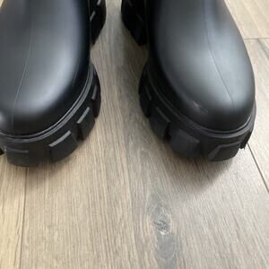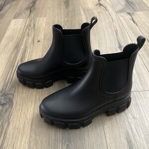 The product is a pair of Jeffrey Campbell Matte Black Pleu Lug Sole Boots in size 7. These platform Chelsea boots feature a solid black color with a pull-on closure, making them stylish and easy to wear. Made with a durable rubber upper material, these boots are perfect for adding a touch of edginess to any outfit. Perfect for women looking for a fashionable and trendy footwear option.