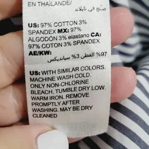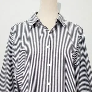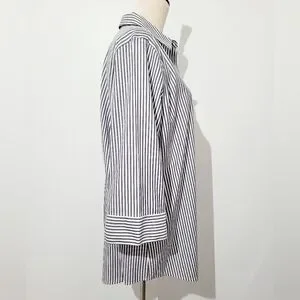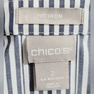 Upgrade your wardrobe with this classic Chico’s No Iron button-front shirt, featuring a timeless blue and white vertical stripe design. Made from a 97% cotton / 3% spandex blend, this top offers both structure and stretch, plus the no-iron fabric keeps it looking crisp with minimal effort.