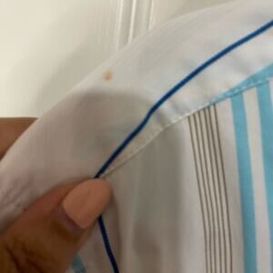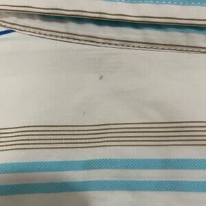 Pre owned button down Y2K 200’s Cotton stripe white blue and tan. Size XXL, from pit to pit 22.5 inches, length 29 inches. There are some small spots around the shoulder and back neckline, please review all photos.