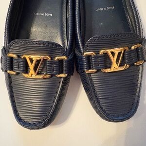 Elegant black loafers with gold accents. Features iconic LV logo. Perfect for stylish comfort.