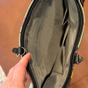 Elevate your style with this artistic women's satchel, featuring a bold black base and vibrant multicolor design. Perfect for making a statement.