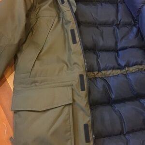 Men's Olive Green Brown down-filled hooded parka.