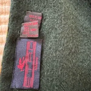 Beautiful, Etro, silk and cashmere scarf. Measurements are approximately 11.5” wide and 54” long, not including the fringe. The silk side is a beautiful rich color pattern. The green, cashmere side does have some moth damage which is why marked “AS IS”. I tried to show some in last two photos. The silk side is pristine. Price is based on condition. Still beautiful!!!