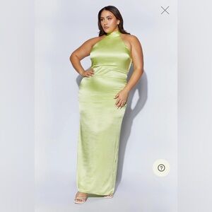 Beautiful champagne colored satin halter top dress - perfect for weddings. Loooved this dress but ordered a size too big, so it’s never been worn! Check out Meshki’s website for sizing info! Included pictures in other colors for reference.