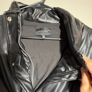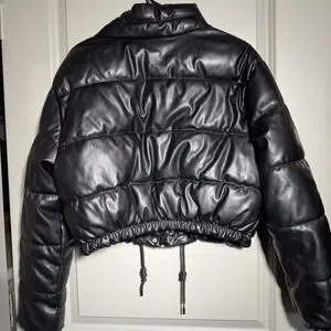 Love Tree black faux-leather cropped puffer jacket in size M, featuring a sleek shiny finish and adjustable drawstring hem for the perfect fit.