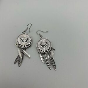 Bohemian Faux Turquoise Beaded Dream Catcher Feather Dangle Earrings Silver Tone