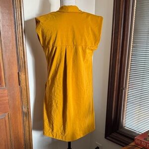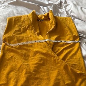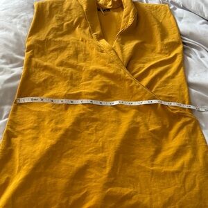 Step out in style with this elegant mustard yellow wrap dress. Perfect for any occasion, this dress offers a flattering fit and a vibrant color that stands out. Ideal for both casual and formal events. Has foam shoulder pads. Inner button to hold on side and wrap with snap on the outside. In great used condition, no flaws or damage to note.