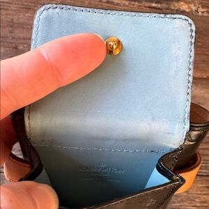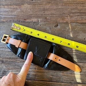 This is a Louis Vuitton logo leather bracelet. It shows some signs of wear so please look at photos. The black logo leather has a small coin purse at the top. The snap works beautifully. The leather buckle is in gold tone, and the leather shows a little bit of cracking. Currently has two holes and one looks to be hand stamped after factory settings. It is set for a seven or a 7 1/2 inch wrist, but there is plenty of room to punch another hole to make it larger. There is some color transfer and wear. Rare and unique LV authentic item. It may have been painted but it looks so professional that I am unsure.