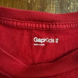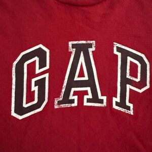 A vibrant red long-sleeved tee by GAP featuring the iconic brand logo on the front and a classic crew neck design for everyday comfort.