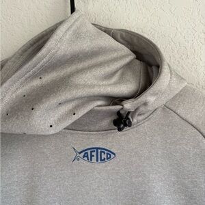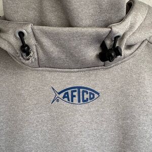 Light gray AFTCO hoodie with front pocket. Features adjustable hood and logo detail.