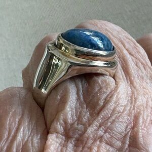 Sterling silver ring with cabochon Denim Lapis oval stone. Bezel set. Great casual piece. Sterling shows scratches and dings consistent with normal wear. See photos for approximate measurements.