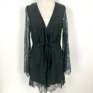Solid black lace long bell sleeve romper/playsuit with drawstring tie waist and plunging v-neckline.