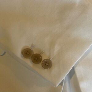 Timeless white blazer with a single-button closure. Ideal for professional and casual settings.