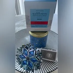 Elegant candle with a deep blue design. Wallflowers Winter refill in a festive blue and silver snowflake nightlight. Perfect for a cozy winter ambiance.