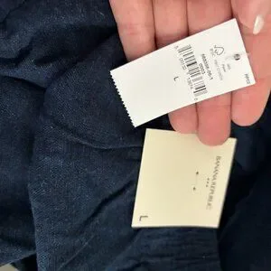 These are great shorts! Banana Republic navy blue linen. Front is flat waist, back is elastic waist. Size L. NWT. Smoke-free / Cavalier-friendly home.