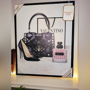 Elevate your space with this chic Valentino-inspired canvas wall art, perfect for any glam room, closet, office, or boutique. This high-fashion piece features a stunning stiletto heel, a signature designer handbag, and an elegant perfume bottle