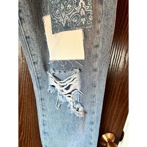 SIMPLE SOCIETY PATCHWORK JEANS WOMENS 7 28 LIGHT WASH DISTRESSED STRAIGHT LEG DENIM