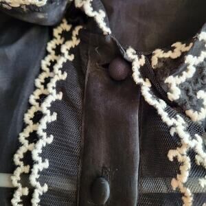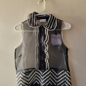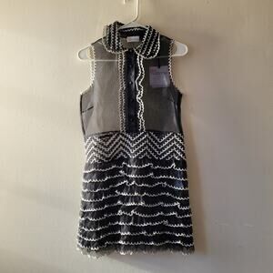Stylish sleeveless dress with chevron pattern. Features a classic collar and sheer detailing. Perfect for elegant occasions.