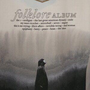 My adult daughter purchased this but never wore it. It is a Taylor Swift branded hooded sweatshirt in a grey ombre colorway. The front of the sweatshirt says "Taylor Swift". The back of the sweatshirt lists the songs on the Folklore album. It is a size large and is oversize. Measurements are as follows: