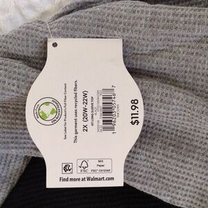 This Holiday Time brand festive Christmas Tshirt has a black background with the words "Tis the season to be jolly" framing 3 Christmas bulbs and some starry/snowy details. With grey, 3/4 length sleeves. This is a light weight waffle knit fabric. New with tags. Size 2X. Approximate measurements when laid flat: