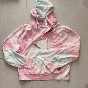 Stylish pink and blue tie-dye hoodie with drawstring hood. Perfect for casual wear.