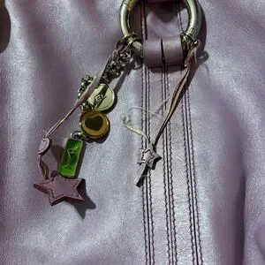 Chic lavender shoulder bag with a roomy interior, ideal for daily use. Features stylish accents and durable straps. Charms show quite a bit of love, but purse is mostly clean.