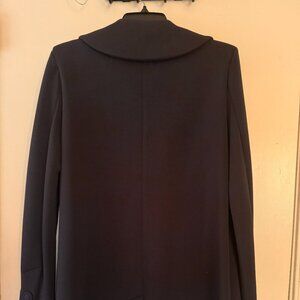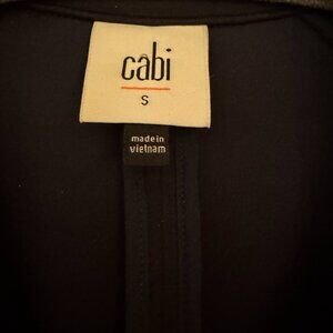 The Cabi At Ease Topper in size small and classic navy color is a versatile mid-length jacket perfect for casual occasions. Made of polyester knit fabric, this lightweight jacket is machine washable and features a solid pattern. With a classic theme and basic jacket style, this CAbi topper is a perfect addition to any woman's wardrobe, especially for the spring season. Ideal for those looking for a comfortable and stylish outerwear option.
