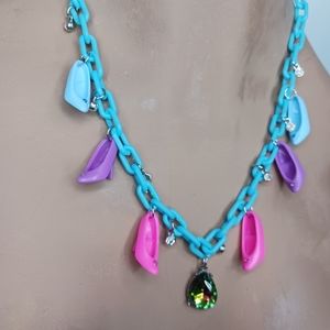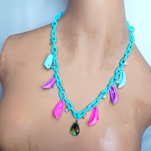 New bright blue plastic chain links with light blue, purple and hot pink vintage 90s shoes with new silver metal, tear drop rainbow gem and iridescent rhinestones.
