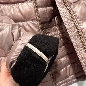 Elegant and warm puffer jacket. Features a glossy finish and zippered pockets. Ideal for cold weather.