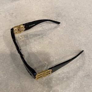 Balenciaga sunglasses - Black frame with gold logo/details. Balenciaga emblem n the right lens. #001 51018-130. There are scratches, so please review photos.