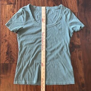 Used, good condition. Elevate your wardrobe with this stylish women's scoop neck top. Perfect for any occasion, this green/blue top offers both comfort and elegance. Size: Large. Measurements see photos.