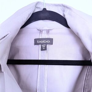 Chic - stunning - ALL THE COMPLIMENTS - light gray jacket by Bebe. Fits like a small or XS. All the various collar and buttoning options plus belt to accentuate waistline