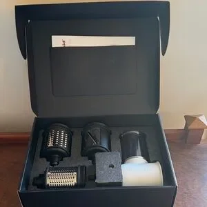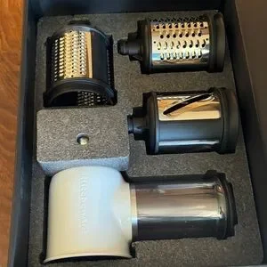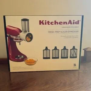 Upgrade your KitchenAid mixer with this red slicer/shredder. Ideal for quick and easy food prep. Brand new in box.
