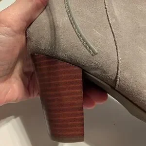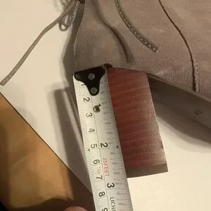 Elegant ruffle design. Light gray suede finish. Perfect for versatile styling.