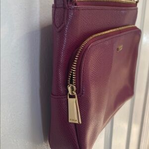 Excellent condition Furla dark fuchsia Leather Crossbody bag. Crafted with premium leather, it offers both durability and sophistication. 9 inches wide, 7 inches tall and 2 inches deep. Top has zipper closure with inside pocket. Outside zipper pocket. Comes with dust cover bag.