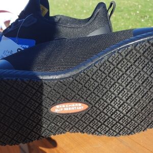 Sleek black Skechers sneakers with lace-up front. Ideal for work shoes.