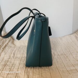 Stylish Coach tote in rich teal blue leather. Features elegant gold accents. Ideal for daily use.