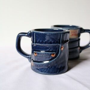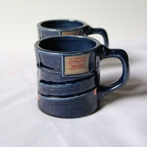 Fabulous set of 2 Levi Strauss blue jean coffee/tea mugs. Mugs are a deep blue jean pattern with the classic Levi label. Each mug stands approx. 3.5" tall and diameter is 3". Pre-owned but in excellent condition, no chips, cracks or stains. Smoke-free, pet friendly home!