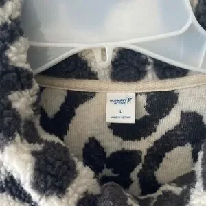 Cozy fleece jacket with a bold black and white pattern. Perfect for warmth and style.