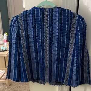 Elegant jacket with bold blue and white stripes. Features a textured pattern and single button closure. Simply stunning!