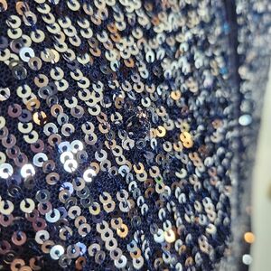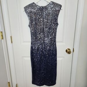 Eliza J navy and silver sequin ombre sleeveless V-neck sheath cocktail dress. Stand out this holiday season with this dress. Fully lined for comfort. Full zipper in the back, small back slit, and slightly extended shoulders. Size 10. Good used condition, some minor sewing imperfections (got to look close to see them), see pics. Measures approximately: 16.5" pit to pit, 14" waist, 41" length, 17" hem, 7" back slit.
