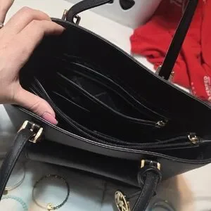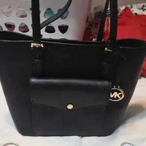 Chic black tote by Michael Kors. Features gold hardware and front pocket. Ideal for daily use.