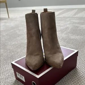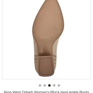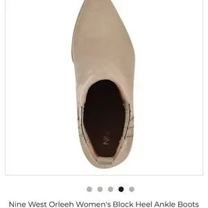 These Nine West ankle booties in tan feature a classic Chelsea design with elastic side panels and a comfortable stacked wooden block heel. The Western-inspired silhouette and slightly pointed toe offer a versatile look, perfect for both casual and semi-formal occasions.