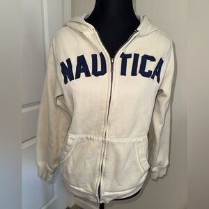 Cream Nautica Hoodie with bold, stitched, navy “NAUTICA” lettering across the chest. Cozy and nautical-inspired—great for casual wear with a sporty twist. Has a pen mark, and a spot on the sleeve, see pictures.