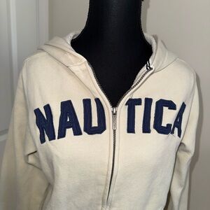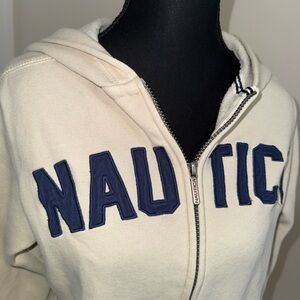Cream Nautica Hoodie with bold, stitched, navy “NAUTICA” lettering across the ch