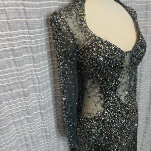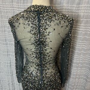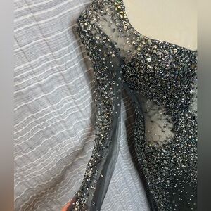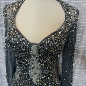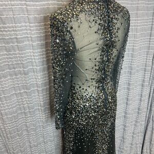 This stunning gunmetal evening gown features intricate embellishments, perfect for special occasions. Its elegant design ensures you stand out with sophistication.