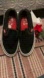 Black Vans slip-ons with red interior. Comfortable and trendy.