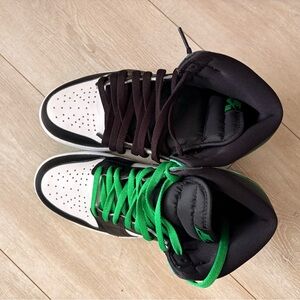 Bold high-top sneakers with a sleek design. Features black, white, and green color scheme. Ideal for making a statement.size 8 men’s