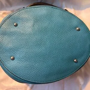 Elevate your style with this Dooney & Bourke teal blue pebble leather bag. Perfect for any occasion, this bag combines elegance and functionality. Some spots inside, but in excellent condition otherwise. Shoulder strap is adjustable. 4 interior pockets and key strap.